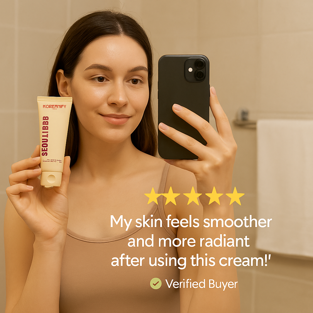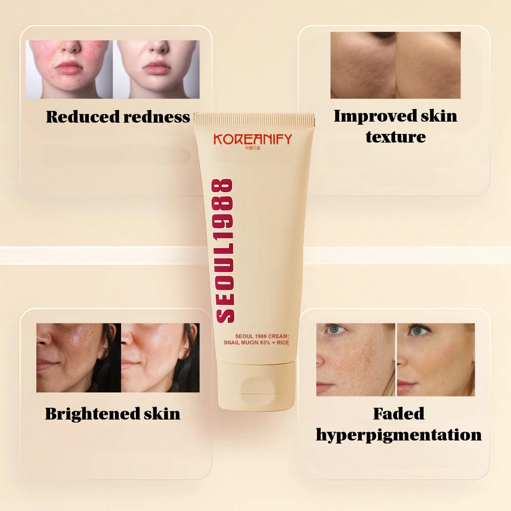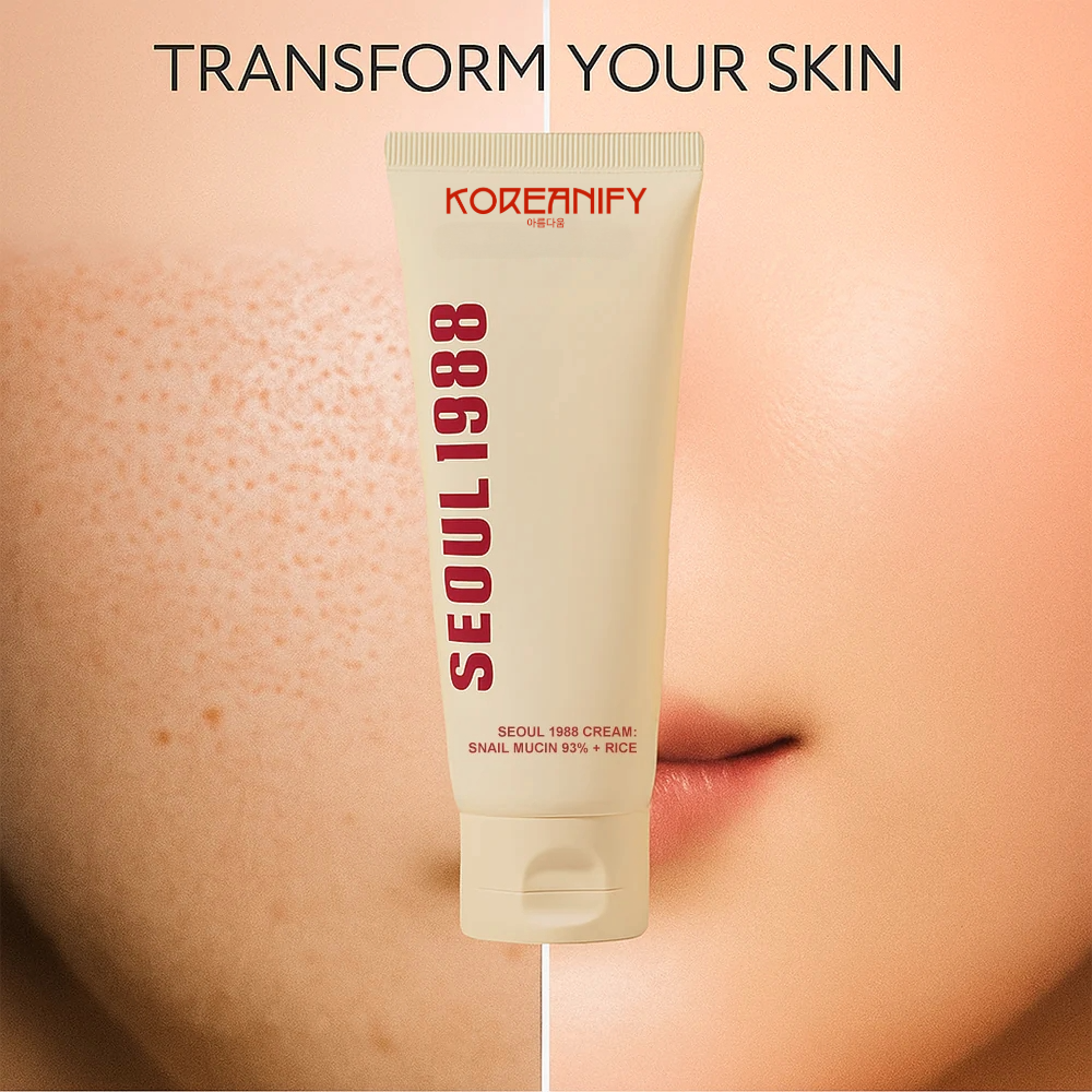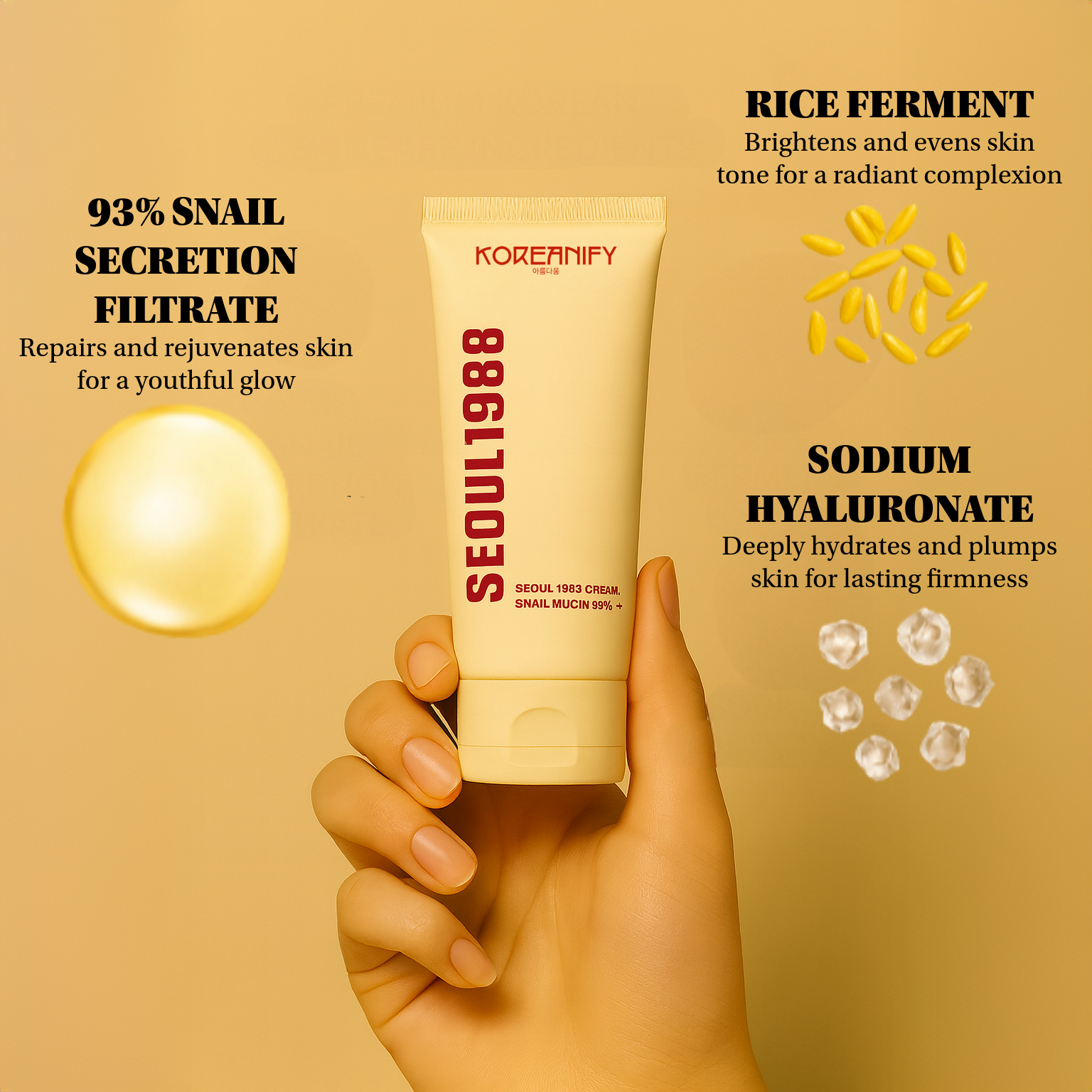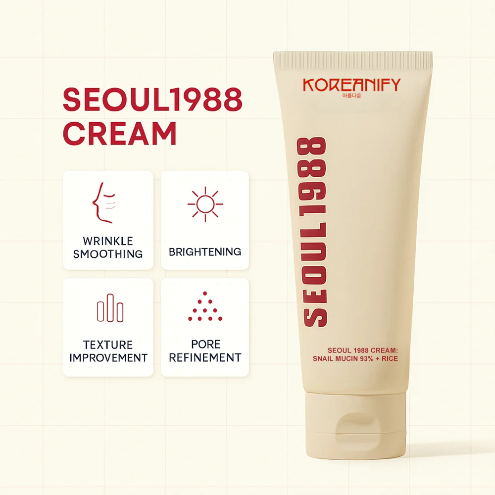 Take a small, pea-sized amount of Koreanify 1988 Snail Mucin Cream. Gently massage or pat over the face and neck with upward motions until fully absorbed.